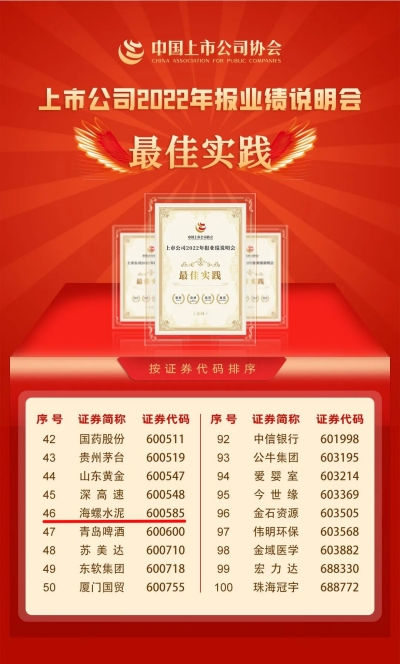 近日,中國(guó)上市公司協(xié)會(huì)發(fā)布“2022年報(bào)業(yè)績(jī)說(shuō)明會(huì)最佳及優(yōu)秀實(shí)踐”評(píng)選結(jié)果,海螺水泥榮獲“上市公司2022年報(bào)業(yè)績(jī)說(shuō)明會(huì)最佳實(shí)踐”獎(jiǎng)。