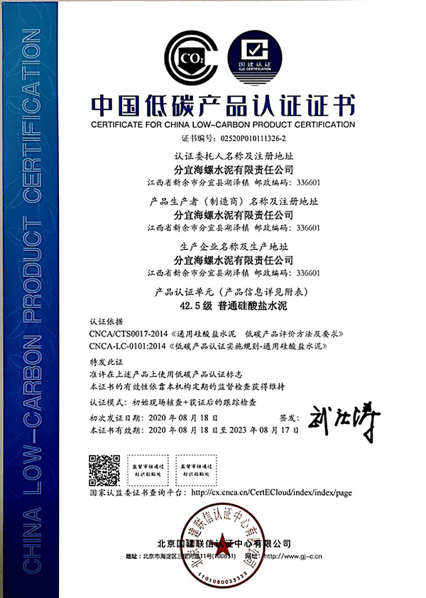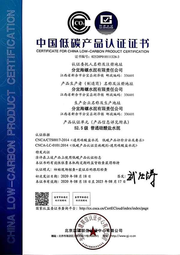 近期,分宜海螺水泥有限責(zé)任公司生產(chǎn)的水泥產(chǎn)品(包含通用水泥熟料、普通硅酸鹽水泥P.O42.5、普通硅酸鹽水泥P.O52.5)順利通過國家低碳產(chǎn)品認(rèn)證審核,獲得《低碳產(chǎn)品認(rèn)證證書》,成為新余首家取得低碳產(chǎn)品認(rèn)證證書的企業(yè)。同時獲得《能源管理體系認(rèn)證證書》。
