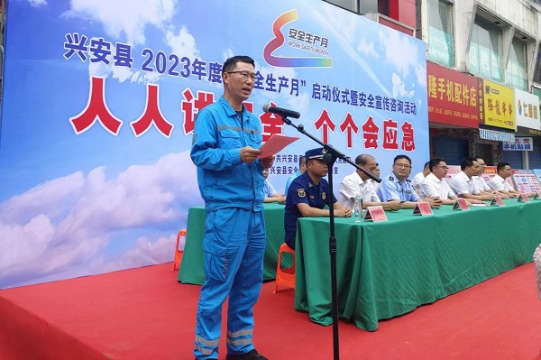“為認真履行企業(yè)主要負責人第一責任人責任,我承諾:全面落實安全生產(chǎn)法規(guī)定職責,帶頭研究組織本企業(yè)重大事故隱患排查整治、帶頭落實全員安全生產(chǎn)崗位責任,發(fā)揮管理團隊和專家作用……堅決防范遏制各類生產(chǎn)安全事故發(fā)生?!?月16日,廣西興安縣安全宣傳咨詢活動現(xiàn)場,興安海螺公司總經(jīng)理任文皓作為全縣企業(yè)代表,作出鄭重承諾。
