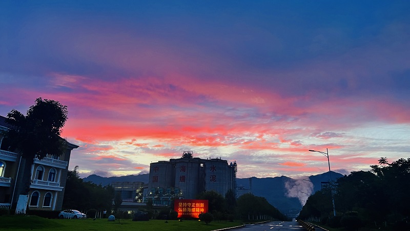 “綠樹(shù)青山帶晚霞,樹(shù)間處處有人家”是明代王直《題畫(huà)》中對(duì)于晚霞美景的描繪。綠樹(shù)、青山、晚霞,還有林間的人家,組成了一副閑適、恬靜的畫(huà)面。紅霞漫天、余暉鋪灑,此刻,自然與人文的和諧之美在海螺水泥的工廠中更顯意味。