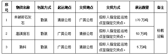 根據(jù)生產(chǎn)用料需要,廣東清新水泥有限公司及廣東清遠(yuǎn)廣英水泥有限公司擬對兩公司間石灰石、石粉、熟料等原材料運輸業(yè)務(wù)面向社會公開招標(biāo),本著“公開、公平、公正”的競爭原則,選擇具備經(jīng)營能力較好、運輸資質(zhì)合格、保供和服務(wù)能力強的運輸保供單位,歡迎具備條件的運輸單位參加,現(xiàn)將有關(guān)事項公示如下: