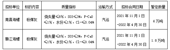 根據(jù)公司生產(chǎn)需求,計劃對粉煤灰進行公開招標,選定中標人,為體現(xiàn)公平、公正、公開的原則,拓寬采購渠道,現(xiàn)將招標相關事宜公告如下: