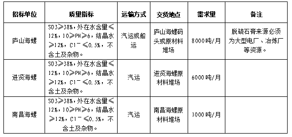 根據(jù)2021年11月-2022年4月脫硫石膏需求,進賢、南昌、廬山海螺計劃進行聯(lián)合招標,選定中標人,為體現(xiàn)公平、公正、公開的原則,拓寬采購渠道,現(xiàn)將招標相關(guān)事宜公告如下: