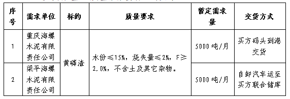 為進一步提升黃磷渣采購招標的公平、公正、公開透明性,根據(jù)重慶、梁平海螺黃磷渣需求,現(xiàn)組織開展黃磷渣采購招標,特將招標事宜公告如下: