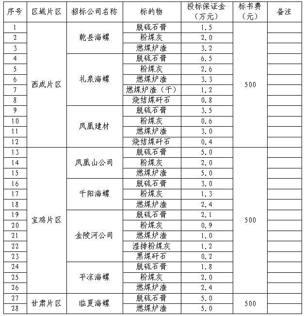 5.陜甘區(qū)域脫硫石膏不接受貨源為大唐渭河電廠、大唐西安熱電廠及黃陵電廠流通渠道投標;陜甘區(qū)域混合材不接受貨源地為麟北電廠及黃陵電廠流通渠道投標;陜甘區(qū)域粉煤灰不接受貨源地為大唐渭河電廠、照金電廠、平涼電廠及瑤池電廠流通渠道投標;乾縣海螺及鳳凰山公司燃煤爐渣不接受貨源地為瑤池電廠的流通渠道投標;平涼海螺脫硫石膏不接受貨源地為平涼電廠的流通渠道投標;金陵河公司及千陽海螺粉煤灰不接受貨源地為大唐寶雞熱電廠的流通渠道投標。