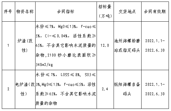 根據(jù)池州、樅陽公司水泥生產(chǎn)經(jīng)營需求,安徽池州海螺水泥股份有限公司、安徽樅陽海螺水泥股份有限公司將對2022年1月1日-2022年6月30日合同期爐渣(改性)開展采購招標工作,為進一步體現(xiàn)公開、公平、公正的原則,現(xiàn)將相關(guān)事宜公告如下: