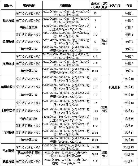 根據(jù)2022年度禮泉海螺、平?jīng)龊B?、千陽海螺、乾縣海螺、臨夏海螺、鳳凰建材、金陵河公司、鳳凰山公司等8家公司生產(chǎn)經(jīng)營(yíng)計(jì)劃,現(xiàn)對(duì)2022年度鐵質(zhì)材料(直供)采購(gòu)組織招標(biāo),為進(jìn)一步體現(xiàn)公平、公正、公開透明的原則,此次招標(biāo)將在安徽海螺水泥股份有限公司陽光采購(gòu)平臺(tái)公開進(jìn)行,現(xiàn)將招標(biāo)采購(gòu)信息發(fā)布如下: