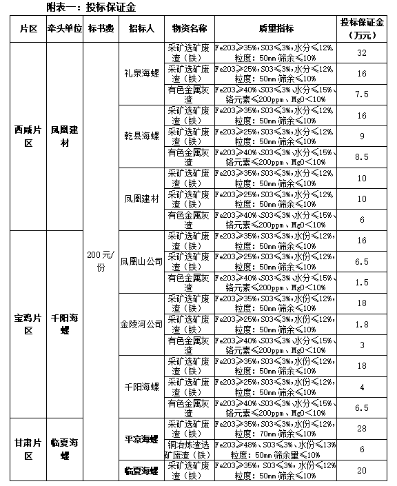 投標(biāo)申請(qǐng)人需承擔(dān)與遞交投標(biāo)文件有關(guān)的費(fèi)用,投標(biāo)申請(qǐng)人在領(lǐng)取標(biāo)書前,應(yīng)以投標(biāo)公司名義和銀行轉(zhuǎn)賬方式交納貳佰元標(biāo)書費(fèi),投標(biāo)人應(yīng)在投遞標(biāo)書之前以投標(biāo)公司名義和銀行轉(zhuǎn)賬方式繳納投標(biāo)保證金(具體費(fèi)用如表中所示),待招標(biāo)結(jié)束后,未中標(biāo)單位交納的投標(biāo)保證金待開標(biāo)后由鳳凰建材公司在10個(gè)工作日內(nèi)無息退還投標(biāo)人,中標(biāo)人的投標(biāo)保證金自動(dòng)轉(zhuǎn)為合同履約保證金,不足部分中標(biāo)人在合同簽訂前以電匯方式(不接受個(gè)人轉(zhuǎn)賬)補(bǔ)齊,合同履約保證金在年度合同履行完畢后30日內(nèi)無息退還。招標(biāo)人不收取任何現(xiàn)金,不接受以個(gè)人賬戶轉(zhuǎn)賬。