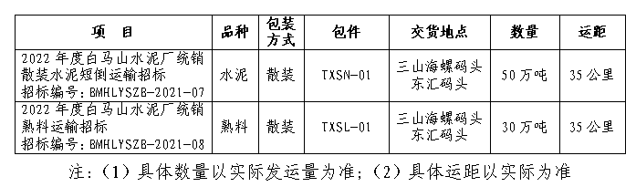 為做好2022年碼頭統(tǒng)銷散裝水泥、熟料發(fā)運(yùn)工作,白馬山水泥廠擬開展發(fā)往蕪湖三山海螺港務(wù)有限公司(簡稱:三山海螺碼頭)及蕪湖東匯港務(wù)有限公司(簡稱:東匯碼頭)二家碼頭散裝水泥、熟料運(yùn)輸招標(biāo)。此次運(yùn)輸招標(biāo)本著“公開、公平、公正”的競爭原則,選擇具備經(jīng)營能力較好、運(yùn)輸資質(zhì)合格、保供和服務(wù)能力較強(qiáng)的中間運(yùn)輸保供單位,歡迎具備條件的運(yùn)輸單位參加,現(xiàn)將有關(guān)事項(xiàng)公示如下: