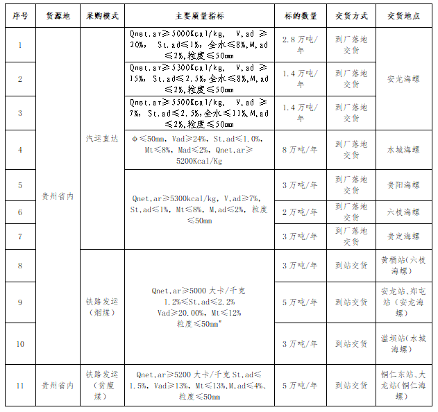 2.投標(biāo)人所提供礦點(diǎn)煤炭生產(chǎn)能力30萬噸/年以上(含30萬噸/年),礦點(diǎn)屬于貴州省內(nèi)資源;