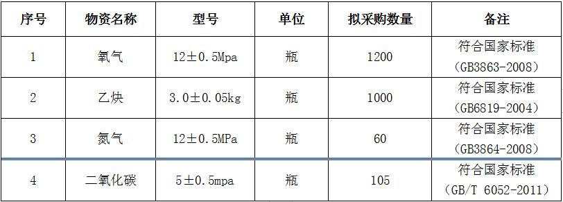 1.招標物資名稱:工業(yè)氣體(氧氣、乙炔、氮氣、二氧化碳)。