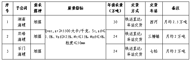 根據(jù)2022年海螺水泥湖南區(qū)域湖南海螺水泥有限公司(以下,簡(jiǎn)稱“湖南海螺”)、雙峰海螺水泥有限公司(以下,簡(jiǎn)稱“雙峰海螺”)、石門海螺水泥有限責(zé)任公司(以下,簡(jiǎn)稱“石門海螺”)三家子公司的鐵路直供煤炭需求,現(xiàn)海螺水泥湖南區(qū)域煤炭招標(biāo)小組擬對(duì)湖南區(qū)域2022年鐵路直供煤炭進(jìn)行網(wǎng)上公開招標(biāo),以選定中標(biāo)人。本次招標(biāo)由湖南海螺牽頭組織,為拓寬采購(gòu)渠道,同時(shí)體現(xiàn)公平、公正、公開原則,現(xiàn)將招標(biāo)相關(guān)事宜公告如下:
