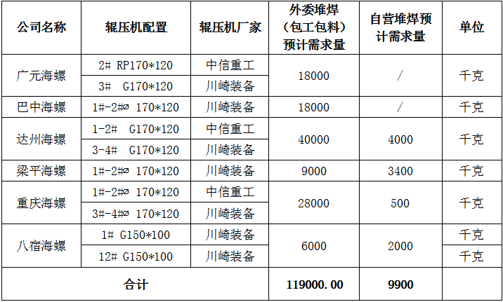 根據(jù)2022-2023年度水泥磨輥壓機(jī)輥面堆焊及日?;y層修補(bǔ)需求,海螺水泥川渝區(qū)域各子公司擬對輥壓機(jī)維修用耐磨焊絲進(jìn)行招標(biāo),為進(jìn)一步體現(xiàn)公開、公平、公正、擇優(yōu)的原則,拓寬采購渠道,保證采購質(zhì)量,現(xiàn)將招標(biāo)相關(guān)信息公告如下: