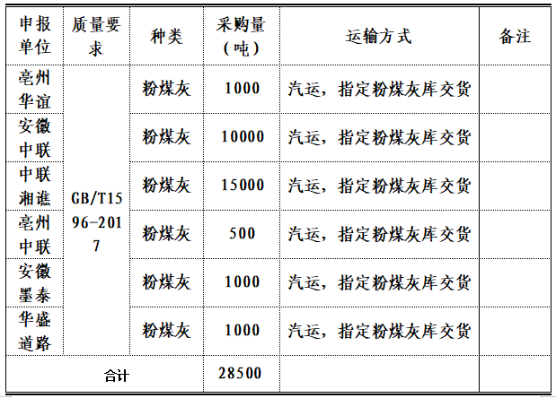 亳州華誼、安徽中聯(lián)、中聯(lián)湘譙、亳州中聯(lián)、安徽墨泰和華盛道路粉煤灰合同將于2021年12月31日到期。為保證合同到期后粉煤灰供貨的有序銜接,根據(jù)《物資采購(gòu)招標(biāo)管理辦法》和《物資采購(gòu)招標(biāo)實(shí)施細(xì)則》相關(guān)制度要求,擬采取公開(kāi)招標(biāo)方式實(shí)施,選定中標(biāo)人。現(xiàn)將相關(guān)事宜公告如下: