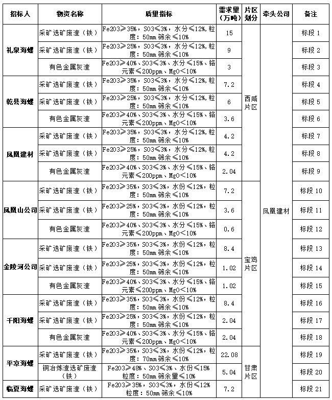 根據(jù)2022年度禮泉海螺、平?jīng)龊B?、千?yáng)海螺、乾縣海螺、臨夏海螺、鳳凰建材、金陵河公司、鳳凰山公司等8家公司生產(chǎn)經(jīng)營(yíng)計(jì)劃,現(xiàn)對(duì)2022年度鐵質(zhì)材料(直供)采購(gòu)組織招標(biāo),為進(jìn)一步體現(xiàn)公平、公正、公開透明的原則,此次招標(biāo)將在安徽海螺水泥股份有限公司陽(yáng)光采購(gòu)平臺(tái)公開進(jìn)行,現(xiàn)將招標(biāo)采購(gòu)信息發(fā)布如下: