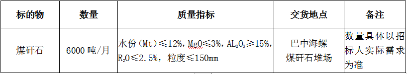 根據(jù)巴中海螺生產(chǎn)經(jīng)營需求,現(xiàn)對生料煤矸石采購業(yè)務(wù)進(jìn)行公開招標(biāo),為體現(xiàn)公平、公正、公開、透明的原則,現(xiàn)將招標(biāo)相關(guān)事宜公告如下: