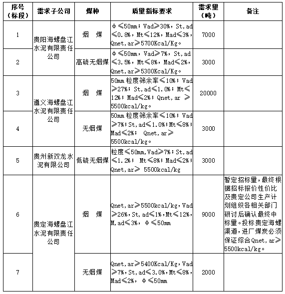 海螺水泥貴州區(qū)域擬對2022年1月21日至2022年2月20日生產(chǎn)用煤炭進行公開招標,選定中標單位,現(xiàn)將相關(guān)招標事宜公示如下: