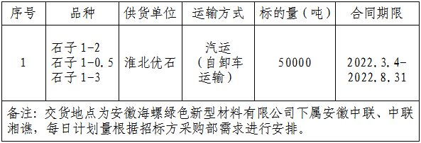 為做好2022年3-8月份淮北優(yōu)石新型環(huán)保建材有限責(zé)任公司(以下簡稱:淮北優(yōu)石)至安徽中聯(lián)、中聯(lián)湘譙骨料運(yùn)輸招標(biāo)工作,由安徽海螺綠色新材料有限公司采購部牽頭,對上述線路骨料運(yùn)輸進(jìn)行公開招標(biāo),特將本次招投標(biāo)的有關(guān)事宜公告如下: