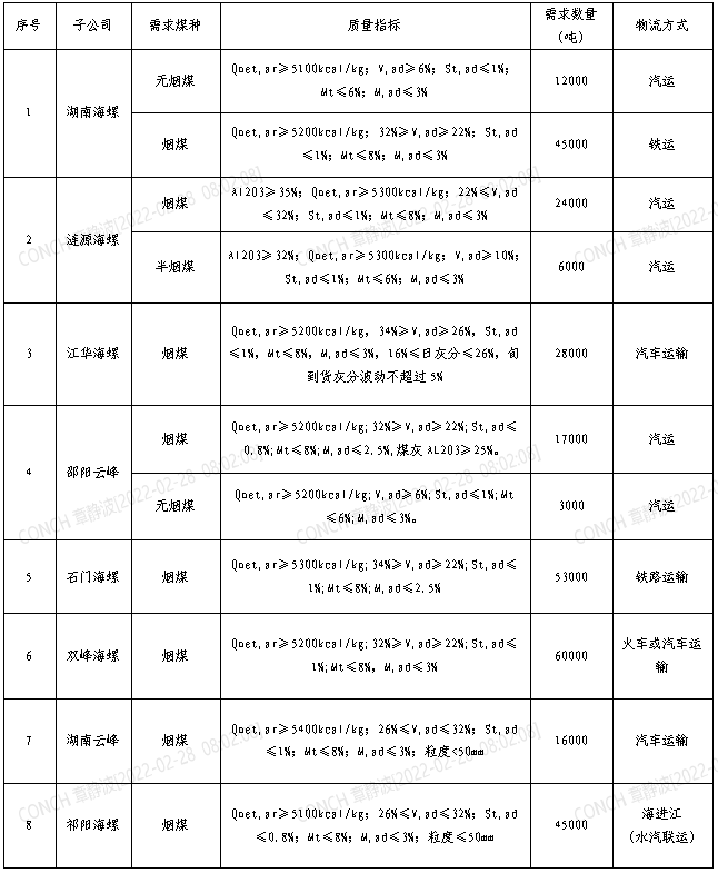 根據(jù)2022年3月21日-2022年4月20日海螺水泥湖南區(qū)域各子公司煤炭需求,現(xiàn)擬對煤炭進行公開招標(biāo),選定中標(biāo)人,為體現(xiàn)公平、公正、公開的原則,拓寬采購渠道,現(xiàn)將招標(biāo)相關(guān)事宜公告如下: