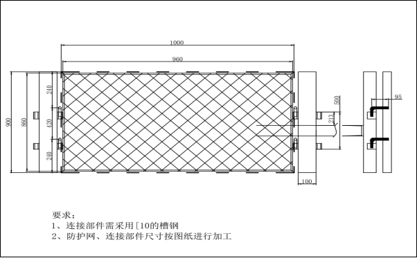 (3)連接部件所用材料:10號(hào)槽鋼(國(guó)標(biāo)),槽鋼長(zhǎng)度與防護(hù)網(wǎng)寬度一致,連接口為及φ12圓鋼及DN20焊管。