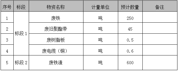 備注:a、自備人工、切割、吊車、叉車、鏟車、運輸車輛、裝車工具等,包含清理場地垃圾費用。b、第二標段廢舊物資為廢鐵渣為生活垃圾焚燒系統(tǒng)焚燒后的廢舊物資,從2022年7月1日起截止2022年12月31日期間垃圾焚燒所產(chǎn)生的廢鐵渣,均由中標單位根據(jù)招標方要求分批次進行回收,不做現(xiàn)場篩選,直接裝車過磅,所產(chǎn)生的一切費用包含在投標報價內(nèi)。