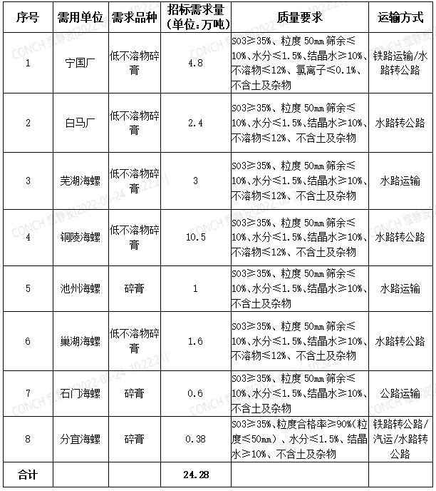 根據(jù)公司生產(chǎn)經(jīng)營計劃,安徽海螺水泥股份有限公司對華東及中部地區(qū)2022年10月-2023年3月天然石膏進(jìn)行招標(biāo),為進(jìn)一步體現(xiàn)公平、公正、公開的原則,拓寬采購渠道,提高采購質(zhì)量,現(xiàn)將招標(biāo)采購信息發(fā)布如下: