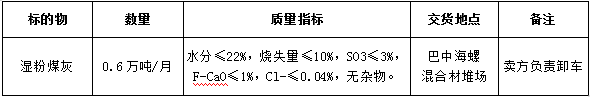 根據(jù)巴中海螺生產(chǎn)經(jīng)營(yíng)需求,現(xiàn)對(duì)水泥生產(chǎn)用濕粉煤灰采購(gòu)業(yè)務(wù)進(jìn)行公開招標(biāo),為體現(xiàn)公平、公正、公開、透明的原則,現(xiàn)將招標(biāo)相關(guān)事宜公告如下: