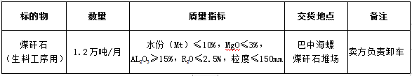 根據(jù)巴中海螺生產(chǎn)經(jīng)營需求,現(xiàn)對生料用煤矸石采購業(yè)務(wù)進(jìn)行公開招標(biāo),為體現(xiàn)公平、公正、公開、透明的原則,現(xiàn)將招標(biāo)相關(guān)事宜公告如下: