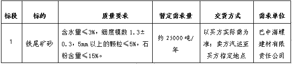 為進一步提升鐵尾礦砂招標的公平、公正、公開透明性,根據(jù)巴中海螺建材(商混)生產(chǎn)需求情況,現(xiàn)組織開展鐵尾礦砂公開招標,特將招標事宜公告如下: