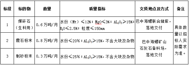 3.投標(biāo)人需具有較強的保供能力,其中標(biāo)段1要求生料用煤矸石月供貨能力不低于0.3萬噸,標(biāo)段2霞石粉末月供貨能力均不低于0.5萬噸,標(biāo)段3制砂粉末月供貨能力不低于0.3萬噸。