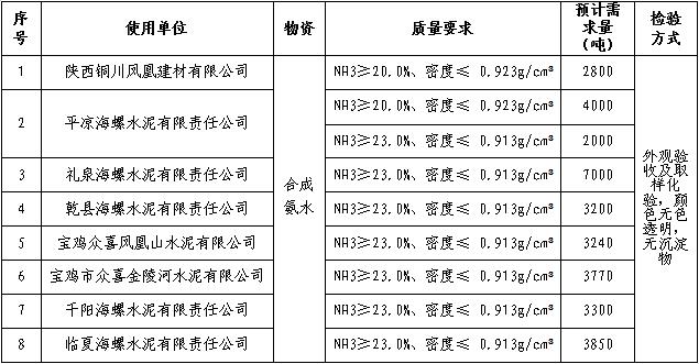 根據(jù)陜甘區(qū)域8家水泥企業(yè)生產(chǎn)經(jīng)營(yíng)計(jì)劃,擬對(duì)2023年度區(qū)域8家公司工業(yè)氨水進(jìn)行公開聯(lián)合招標(biāo),為進(jìn)一步體現(xiàn)“公平、公正、公開”的原則,此次招標(biāo)在安徽海螺水泥股份有限公司海螺陽(yáng)光智慧采購(gòu)平臺(tái)公開進(jìn)行。現(xiàn)將招標(biāo)采購(gòu)信息發(fā)布如下: