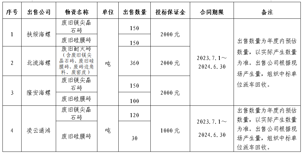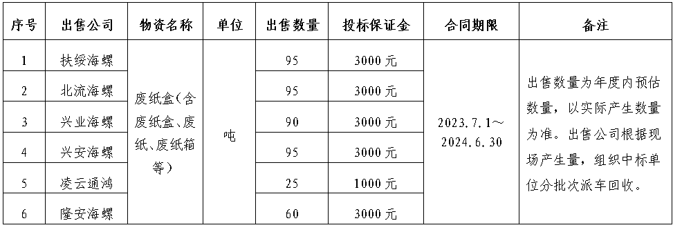 為規(guī)范區(qū)域內(nèi)各公司自動(dòng)插袋包裝機(jī)所用自動(dòng)袋外包裝紙盒(簡(jiǎn)稱:廢紙盒)、廢舊耐火磚出售管理,保證廢紙盒、廢舊耐火磚出售過程的公開、公平、公正,擬開展廣西區(qū)域2023-2024年度廢紙盒、廢舊耐火磚出售招標(biāo)工作,現(xiàn)將招標(biāo)信息公示如下: