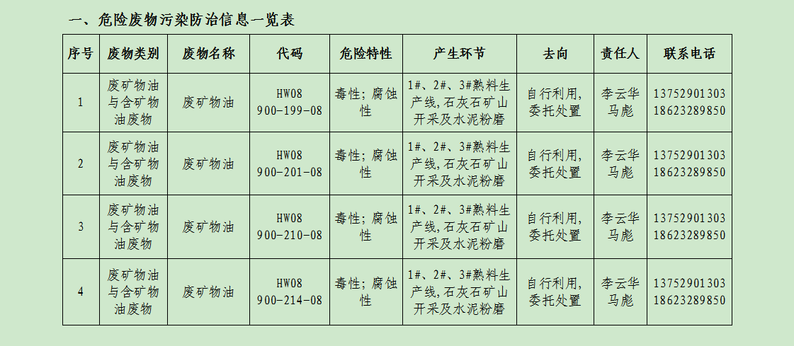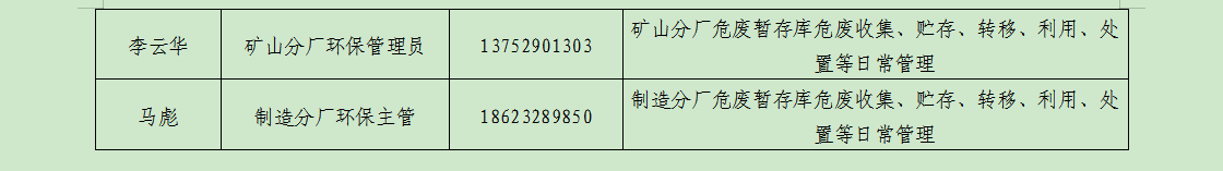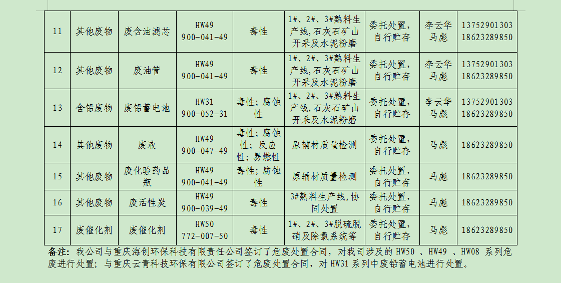 廢棄物的產(chǎn)生單位及管理:礦山分廠由俸云龍負(fù)責(zé)管理,負(fù)責(zé)督促員工把產(chǎn)生的危廢分類定期送危廢庫暫存,危廢庫由維修工段工段長負(fù)責(zé),負(fù)責(zé)收集并記錄危廢臺賬;主廠區(qū)由易軍負(fù)責(zé)管理,負(fù)責(zé)督促員工把產(chǎn)生的廢分類定期送危廢庫暫存,危廢庫由環(huán)保主管馬彪負(fù)責(zé),負(fù)責(zé)收集并記錄危廢臺賬。危廢庫危廢定期聯(lián)系重慶海創(chuàng)環(huán)保科技有限責(zé)任公司、重慶云青環(huán)??萍加邢薰?/span>等有資質(zhì)公司回收處理并完善相應(yīng)危廢聯(lián)單。
