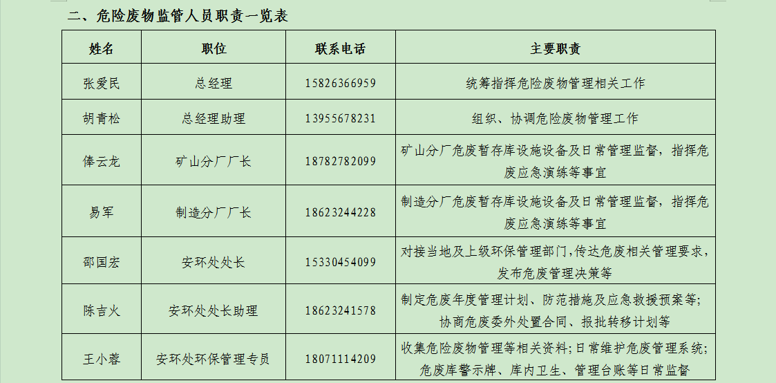 1.成立以總經(jīng)理張愛民為主要負(fù)責(zé)人,辦公室、安全環(huán)保處及各部門負(fù)責(zé)人參加的危險(xiǎn)廢物意外事故處理領(lǐng)導(dǎo)小組,負(fù)責(zé)組織、指揮、協(xié)調(diào)意外事故發(fā)生時(shí)的緊急處理工作。