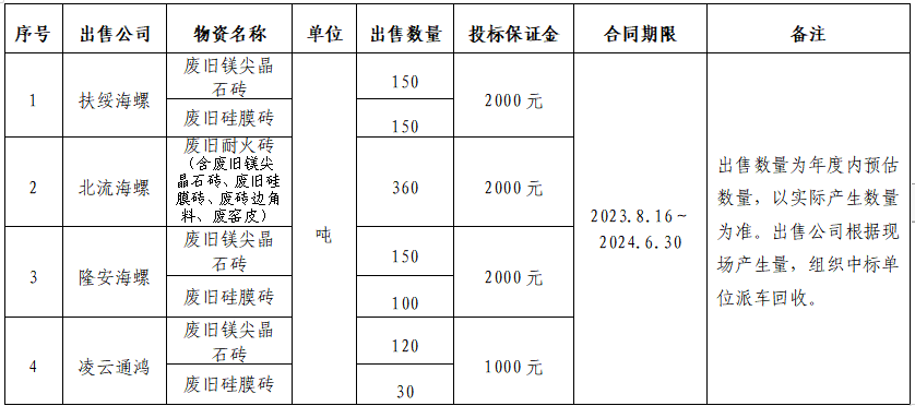 為規(guī)范區(qū)域內(nèi)各公司廢舊耐火磚出售管理,保證廢舊耐火磚出售過程的公開、公平、公正,擬開展廣西區(qū)域2023-2024年度廢舊耐火磚出售招標(biāo)工作,現(xiàn)將招標(biāo)信息公示如下: