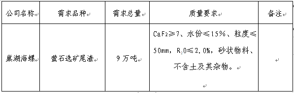 為做好巢湖海螺水泥有限責(zé)任公司螢石選礦尾渣供應(yīng)工作,確保產(chǎn)品的可靠性、穩(wěn)定性,規(guī)范采購(gòu)行為,本著“公開(kāi)、公平、公正”的競(jìng)爭(zhēng)原則,選擇經(jīng)營(yíng)能力較好、產(chǎn)品質(zhì)量較優(yōu)、保供和服務(wù)能力較強(qiáng)的供貨單位,特將本次招標(biāo)的有關(guān)事宜公告如下,歡迎有實(shí)力的投標(biāo)單位參加本次招投標(biāo)活動(dòng):