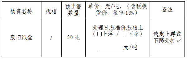 2、對于本次廢紙盒投標(biāo)價(jià)格采用卓創(chuàng)資訊網(wǎng)(https://index.sci99.com)廢紙價(jià)格指數(shù)報(bào)價(jià),出售價(jià)格為出售當(dāng)日(以車輛重車過磅時(shí)間為準(zhǔn))卓創(chuàng)資訊網(wǎng)廢紙價(jià)格指數(shù)±xx元/噸。若處理當(dāng)日指數(shù)停發(fā),以停發(fā)前一日發(fā)布的指數(shù)為準(zhǔn)。