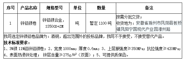 1、招標(biāo)物資信息:宣城海螺建筑光伏公司2024年3月-2024年6月生產(chǎn)用鋅鎂鋁卷(根據(jù)項目結(jié)束時間)。