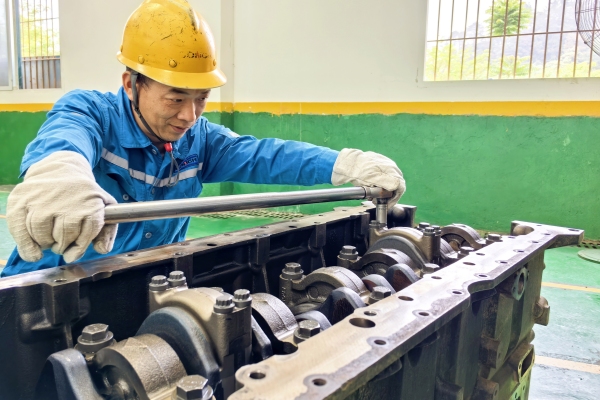 礦山分廠工程機(jī)械維修工馮勝元全神貫注地操控著扭力扳手,對TR50礦車發(fā)動機(jī)連桿螺栓實施精準(zhǔn)施力。這項看似簡單的預(yù)緊作業(yè),實則是保障動力核心穩(wěn)定運(yùn)轉(zhuǎn)的關(guān)鍵工序,凝結(jié)著延長設(shè)備服役周期的匠心。(胡萬禹/攝)