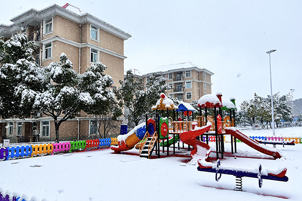皚皚白雪包裹著童趣盎然的游樂場(chǎng),與遠(yuǎn)處淺褐色的宿舍樓剪影相映成趣。