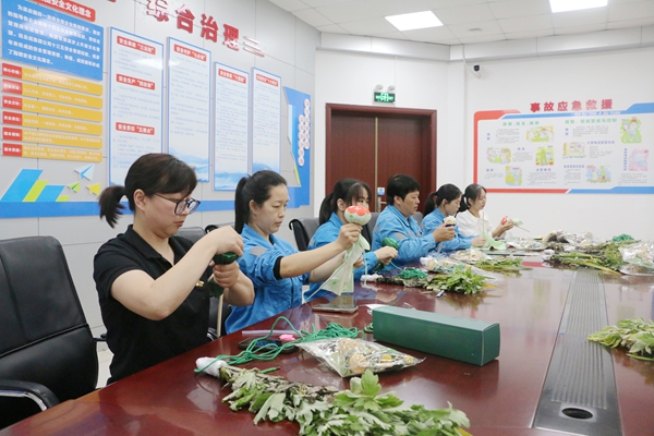 大家先將新鮮的艾草與菖蒲精心搭配,再用寓意吉祥的五彩繩細(xì)細(xì)捆扎。有的職工別出心裁地在門(mén)掛上系上親手縫制的香囊,有的則用工整的字跡在紅紙上寫(xiě)下“平安順?biāo)臁钡淖8UZ(yǔ)掛在艾草枝頭,大家精心捆扎的端午門(mén)掛各具特色。有的職工將做好的艾草錘送給長(zhǎng)期伏案的同事希望能幫助他緩解疲勞。還有人打算把門(mén)掛掛在班組的大門(mén)上,希望2025年工作順順利利。