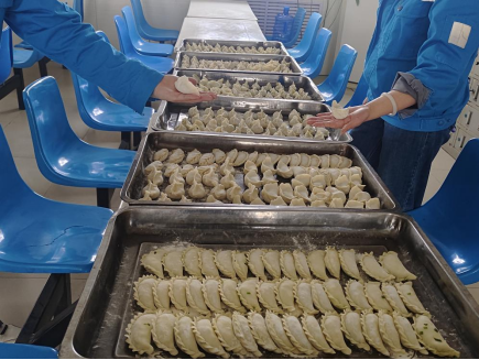 上午10點(diǎn),各部門員工陸續(xù)來到食堂,暫時(shí)放下手頭工作洗凈雙手,圍著站著長桌旁,桌上早已擺好了餃子皮、餡料等,對于許多老員工而言,這已是熟悉的場景,對于新同事而言,則是充滿期待的新體驗(yàn)。