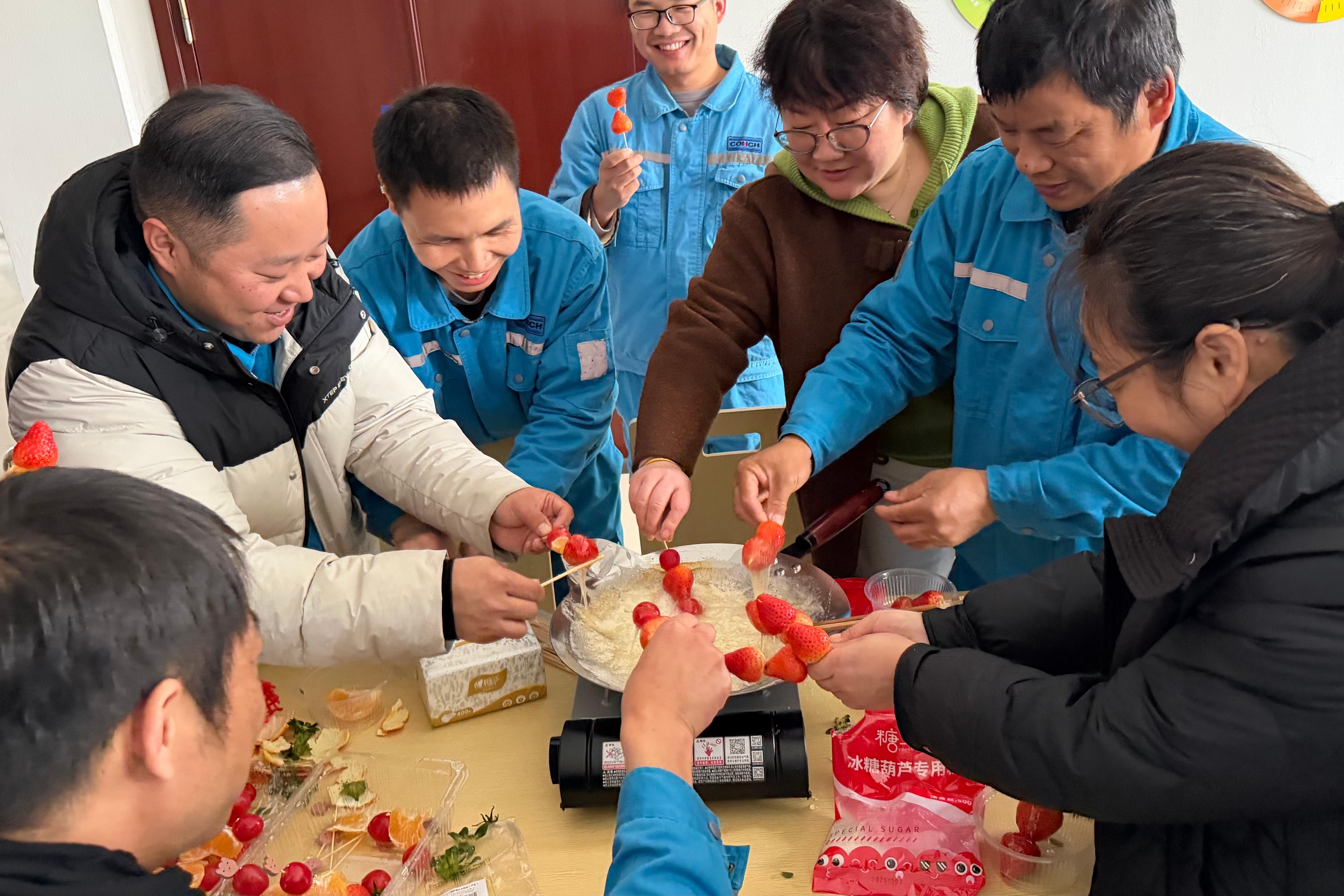 “串”承心意,“甜”滿荻港。冰糖葫蘆是冬日街頭的一抹亮色,是許多人童年記憶里的甜。這次,我們把這份甜蜜帶進(jìn)了公司——讓大家親手串起屬于自己的冬日味道?;顒?dòng)現(xiàn)場(chǎng),同事們精心挑選新鮮水果,細(xì)心串連成串,再裹上晶瑩透亮的糖衣。一串串自制的冰糖葫蘆,不僅色澤誘人,更承載著動(dòng)手的樂趣與心意。品嘗時(shí),大家都笑著說:“自己做的,果然格外甜。”