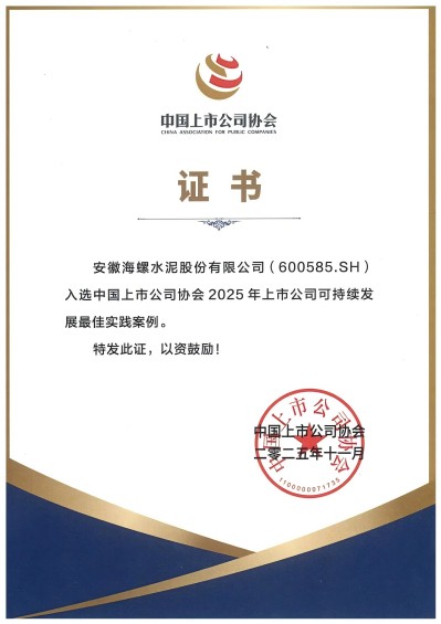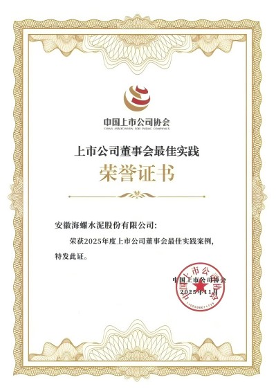 2025年11月18日,中國上市公司協(xié)會在北京召開了第三屆理事會第六次會議和2025上市公司可持續(xù)發(fā)展大會,大會舉行了“2025董事會最佳實踐案例”“2025可持續(xù)發(fā)展最佳實踐案例”發(fā)布儀式,海螺水泥同時榮獲“2025董事會最佳實踐案例”和“2025上市公司可持續(xù)發(fā)展最佳實踐案例”。