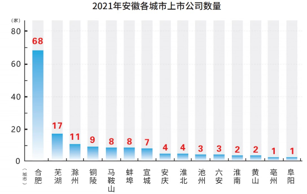 上市公司是區(qū)域經濟發(fā)展的“晴雨表”。截止2021年底,合肥上市公司數量達到68家,在省內遙遙領先,在全國內地289個城市排名居第14位;蕪湖和滁州上市公司數量分別為17家、11家。