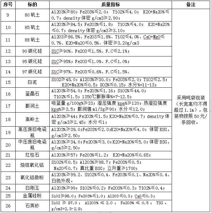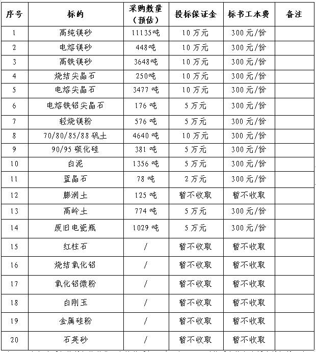 4、上述88礬土、97碳化硅、紅柱石、燒結氧化鋁、白剛玉、金屬硅粉和石英砂等招標采購原材料,因采購量不確定,本次招標僅作為本公司采購備用原材料??紤]上述原材料存在無執(zhí)行情況,投標保證金、標書工本費和合同履約保證金暫不收取。