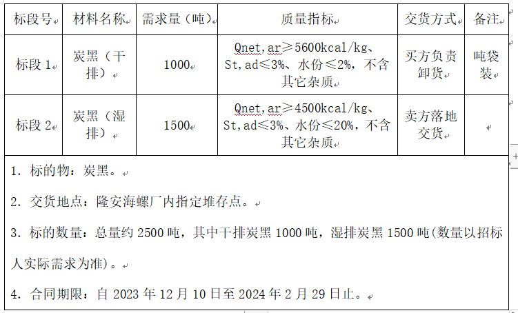根據(jù)隆安海螺水泥有限責(zé)任公司生產(chǎn)需求,擬對生產(chǎn)用炭黑進(jìn)行招標(biāo)采購,為體現(xiàn)公平、公正、公開的原則,通過網(wǎng)上海螺陽光智慧采購平臺(tái)(網(wǎng)址:http://srm.chinaconch.com/)進(jìn)行公開招標(biāo),現(xiàn)將招標(biāo)相關(guān)事宜公告如下:
