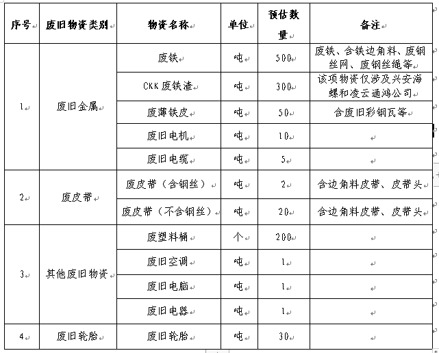 1.包含但不限于以上廢舊物資類別,同時數(shù)量僅為預估數(shù)量,具體數(shù)量以實際過磅或點數(shù)回收數(shù)量為準。