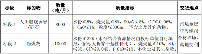備注:標(biāo)段2可選擇目錄為“粉煤灰(粗)、濕粉煤灰、燃爐煤渣”等中的一種,也可根據(jù)自身資源填報其他物資名稱,質(zhì)量必須滿足招標(biāo)方使用,其中濕粉煤灰水分最高不高于22%,其他品種粉煤灰水分最高不高于10%,不設(shè)下限,合同質(zhì)量指標(biāo)及質(zhì)量結(jié)算條款參照標(biāo)段2執(zhí)行。