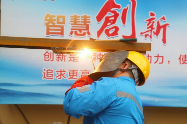 同一賽場上,制造分廠機(jī)械維修工馮雙正在馬不停蹄地進(jìn)行手工焊接,飛濺的焊花與“智能創(chuàng)新”的標(biāo)語交相輝映。(陳龍/攝)